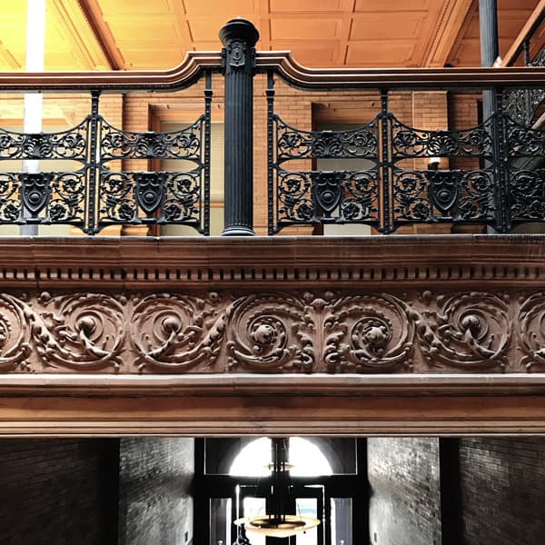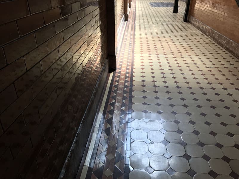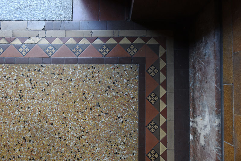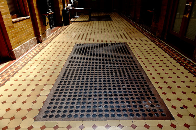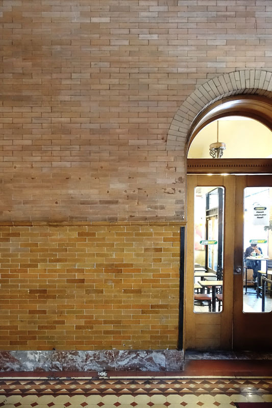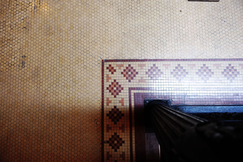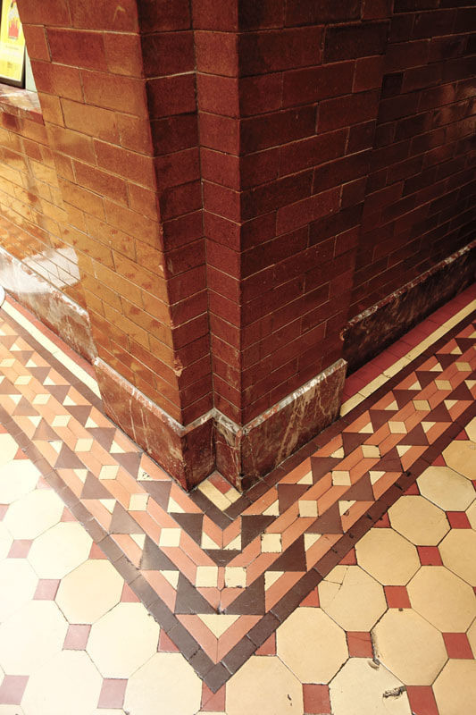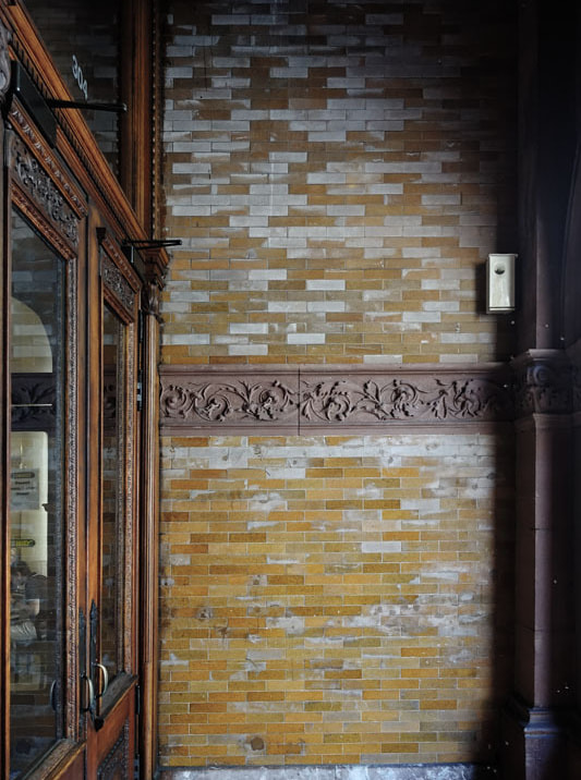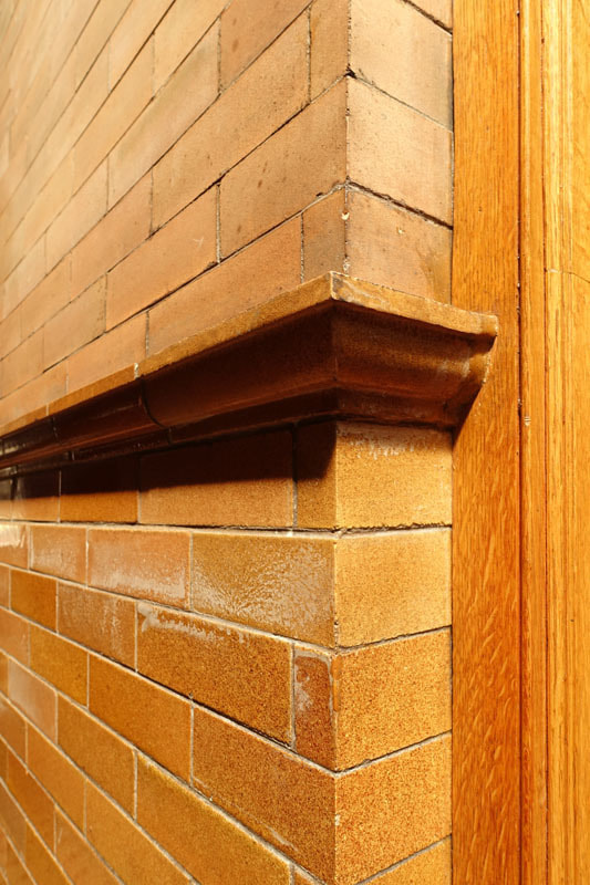 壁面下段にはタイルが張られ、モールデングを挟んで上部はレンガとなっている。この張り分けは単なる意匠なのかとも考えられるが、アメリカではもともとタイルは汚れ難い機能商品という考えが強いため、人が触って汚れる部分だけタイルを使用したのかとも考えられる。