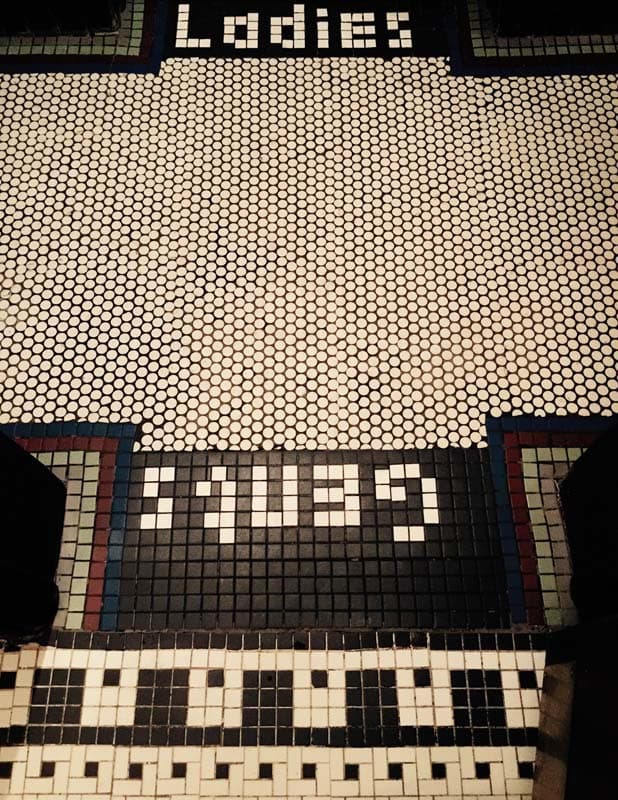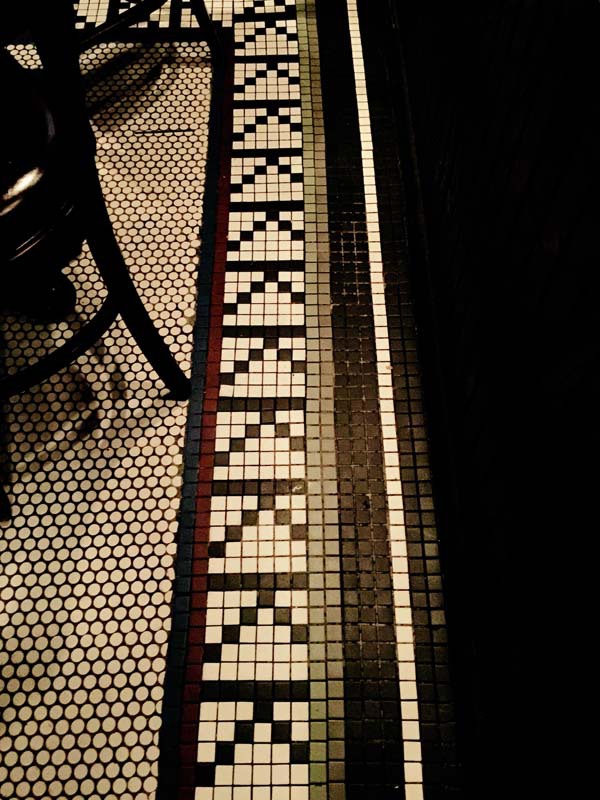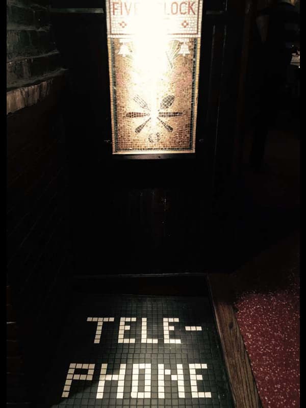 電話ボックスの前にはモザイクタイルでTELEPHONEの文字が。