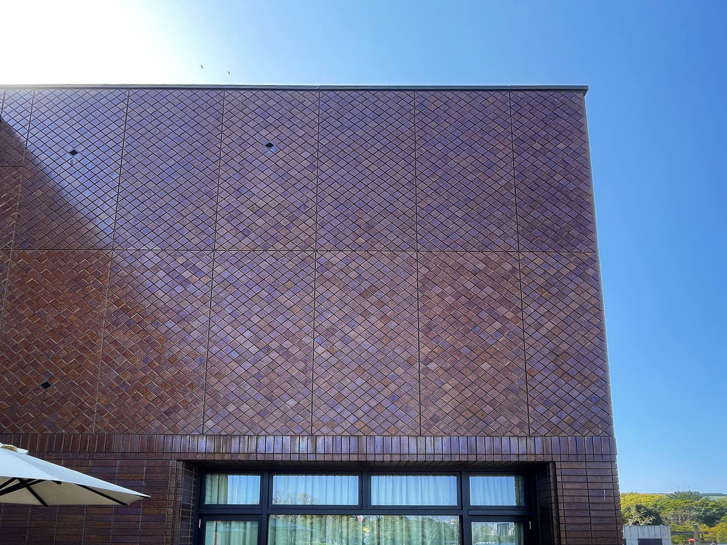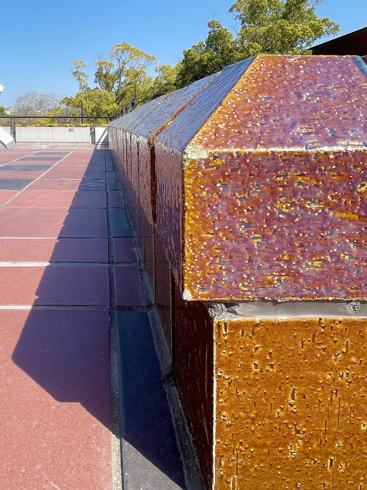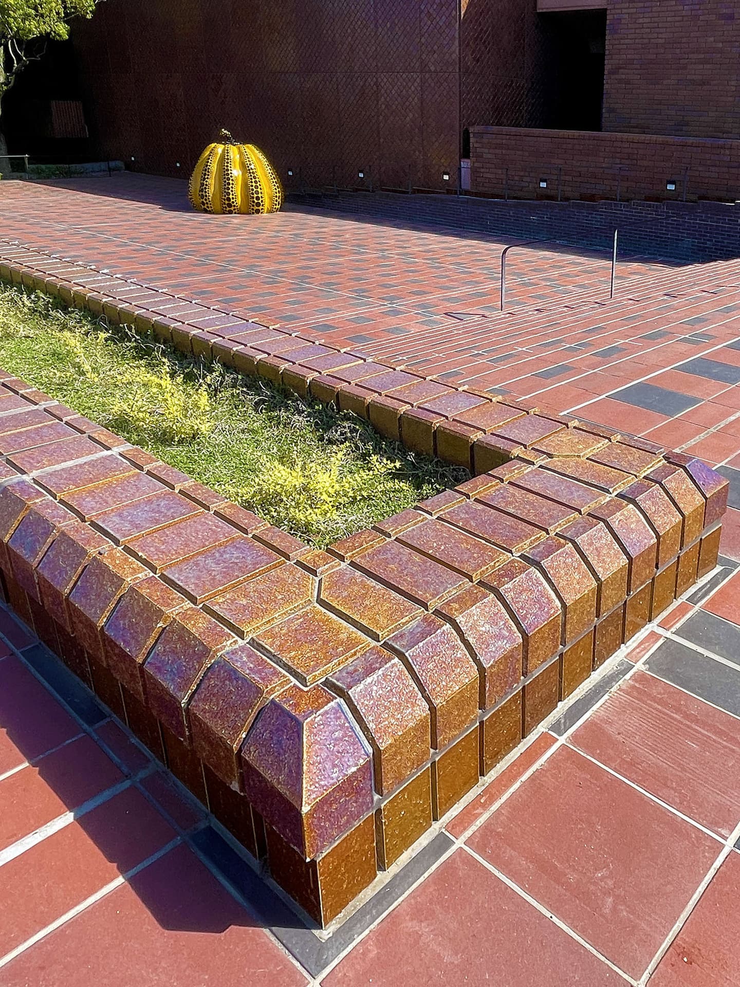 複雑な形状に合わせて全て一体物にて成形されたタイルが張られている。