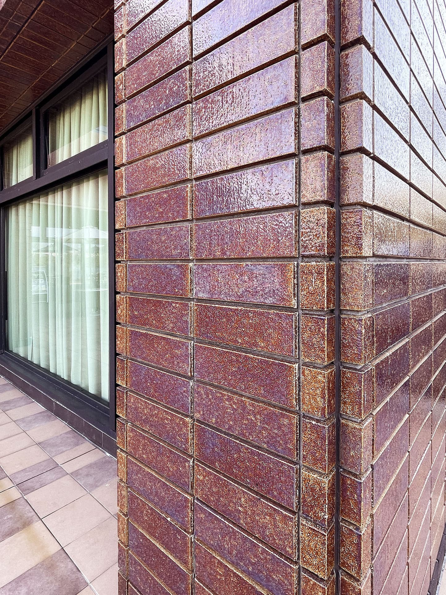 建物や柱の出隅み部分の納まりは、段状に入り隅みを設けた意匠になっており、その陰影により建物のエッジが強調され重厚感を演出している。
