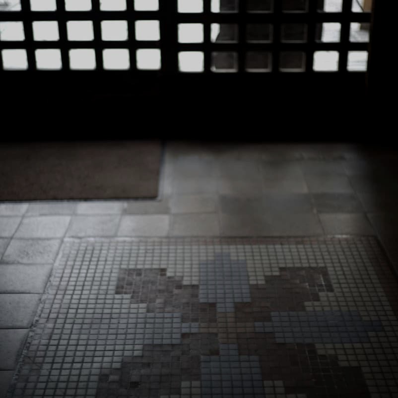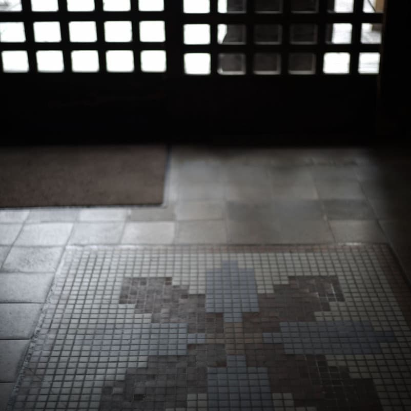 格子戸を開け中に入ると100mm角のタイルが敷き詰められ、中央には15mm角のモザイクタイルが貼られている。