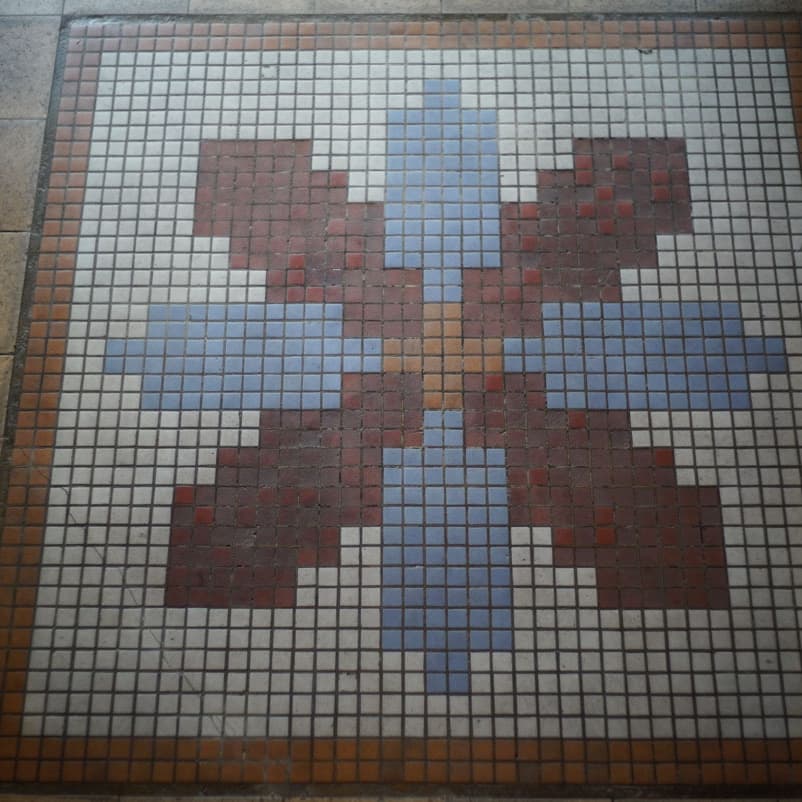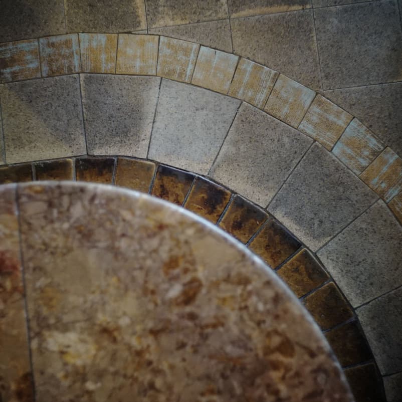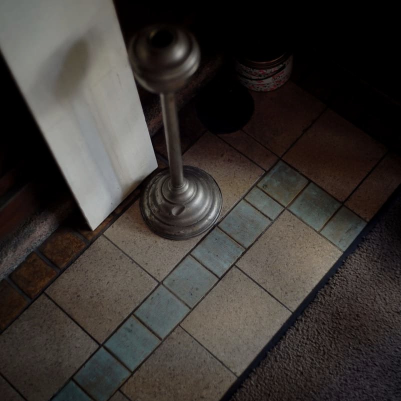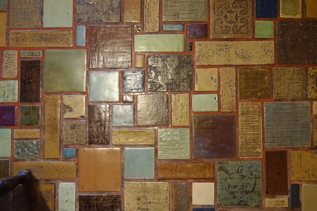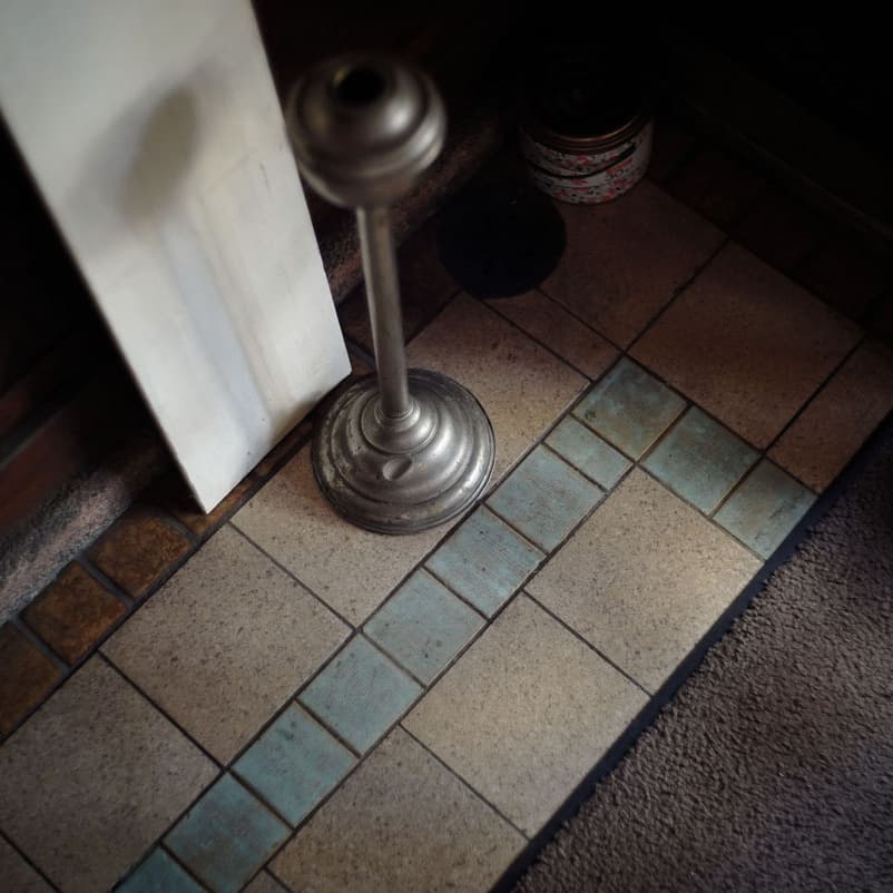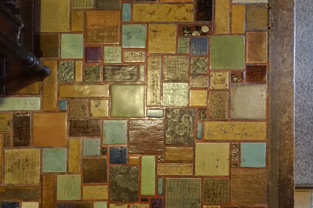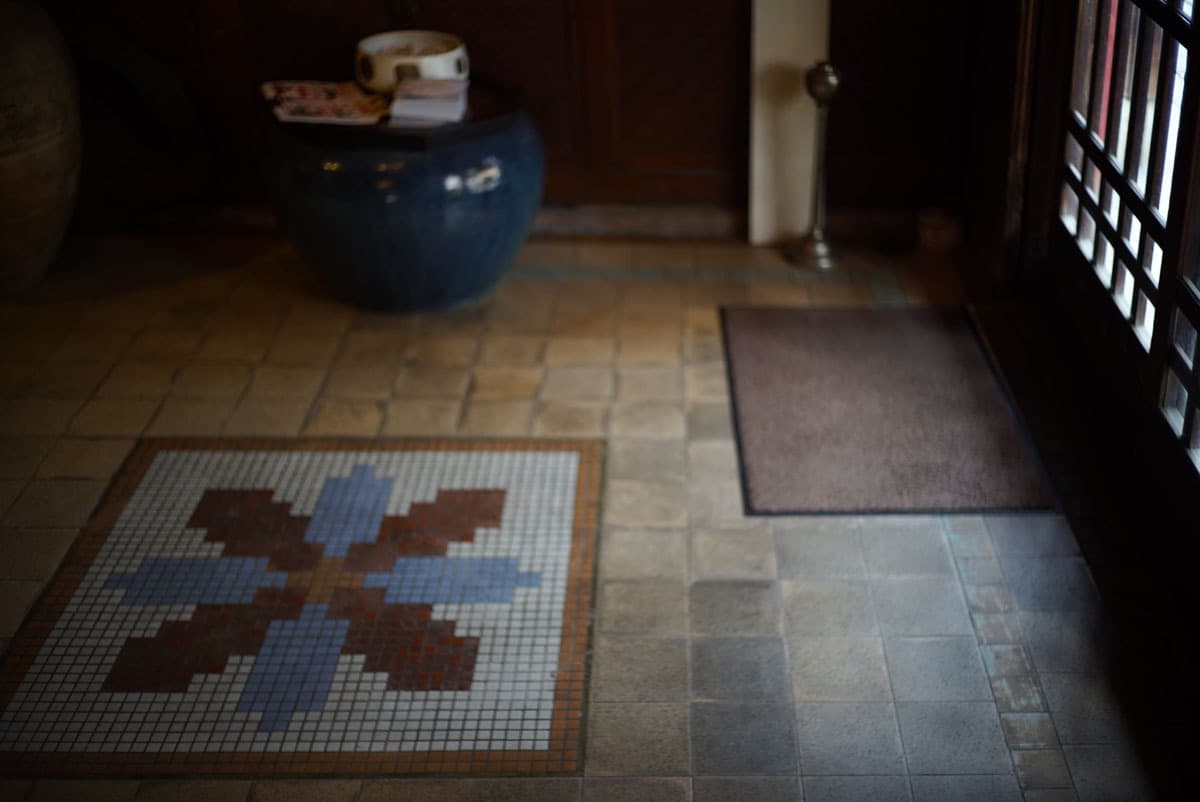 土間から一段上がった所には、形状や色の違うタイルが組み合わせて並べられている。
