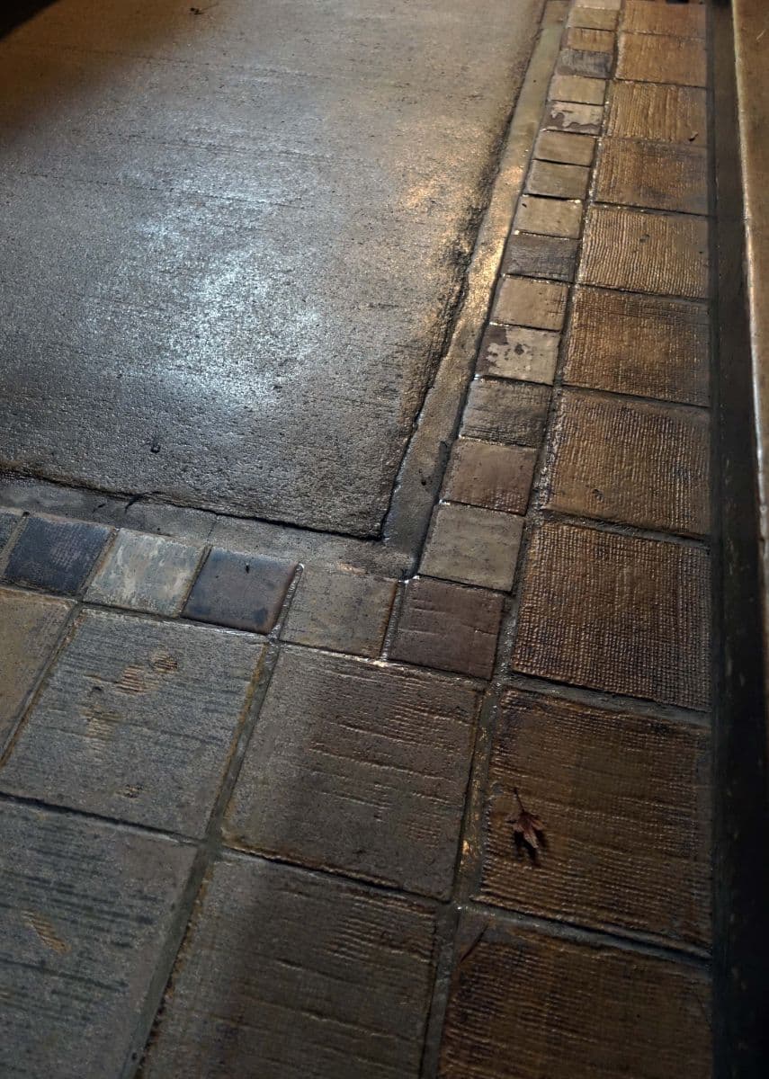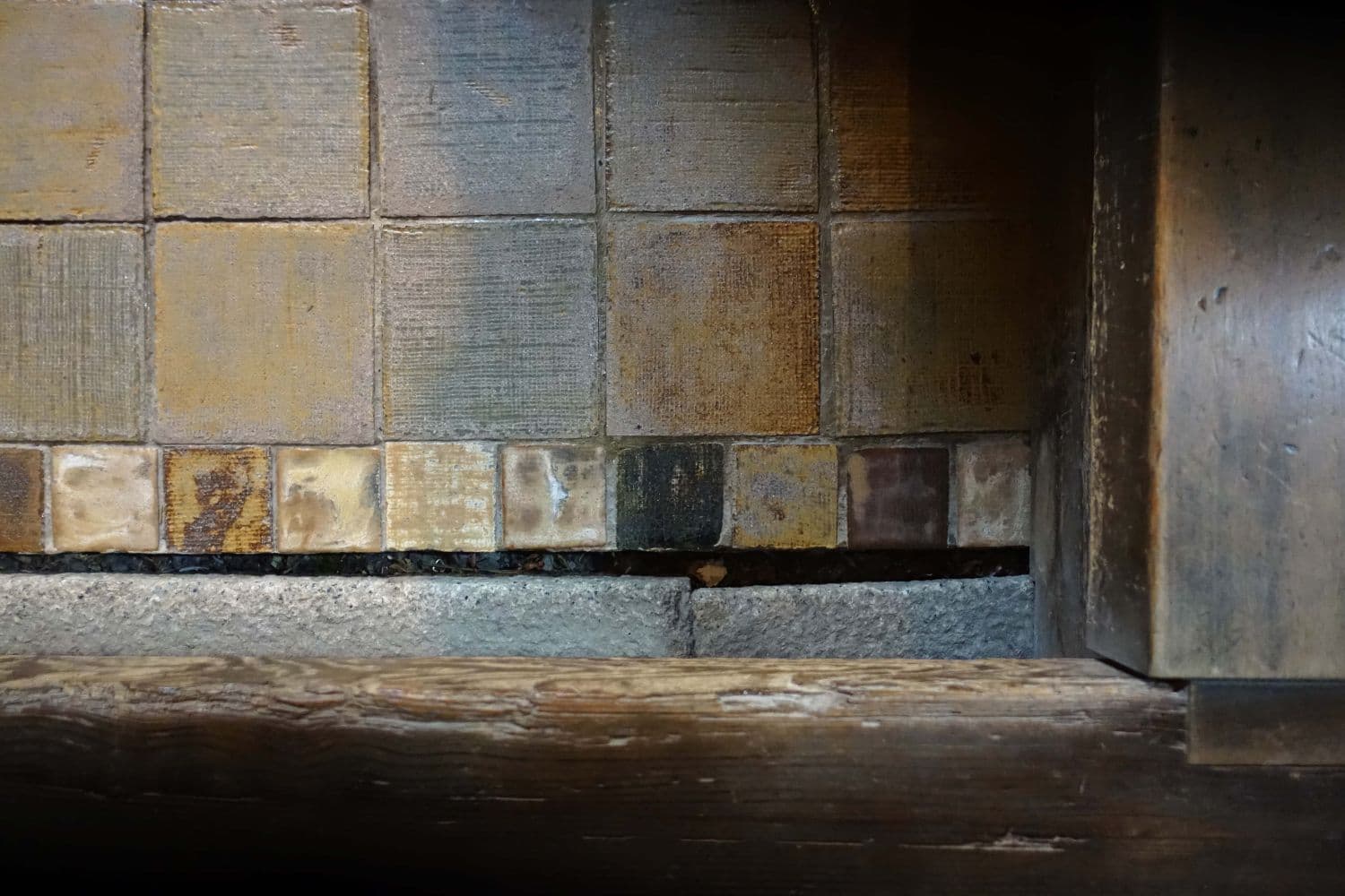 きんせ旅館で紹介したタイルと同じ泰山タイルだと思われる、布目の施された2種類の大きさのタイルが張られているのだが、定規を持っていなかった為、正確な寸法を測ることができなかった。150mm角と75mm角だと思うが微妙にそれよりも大きい様な気がする。