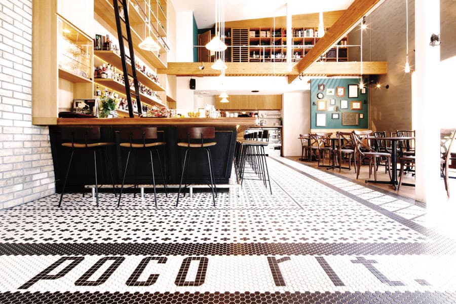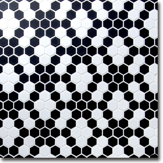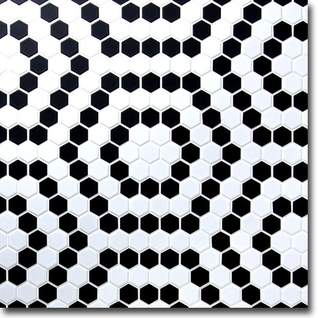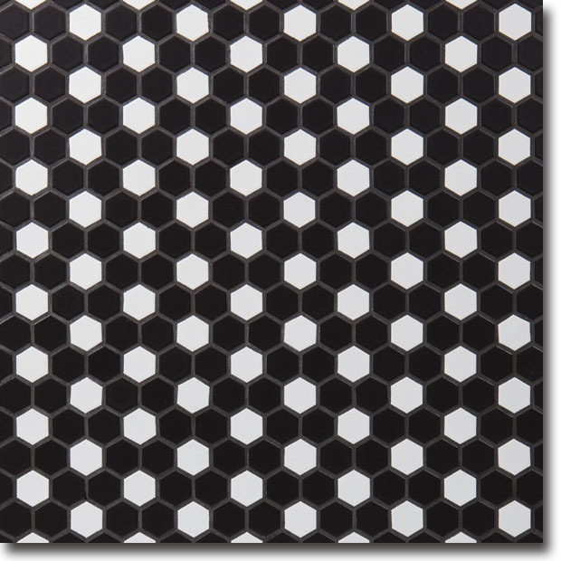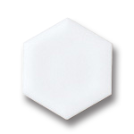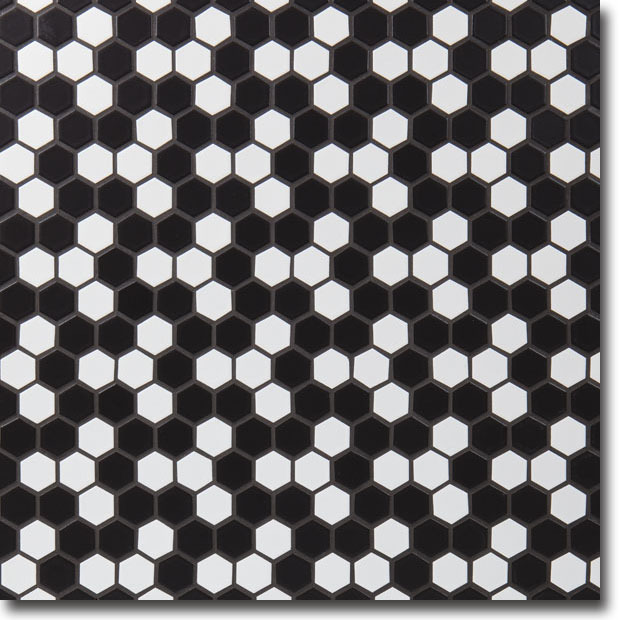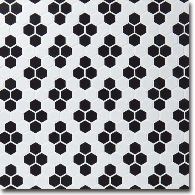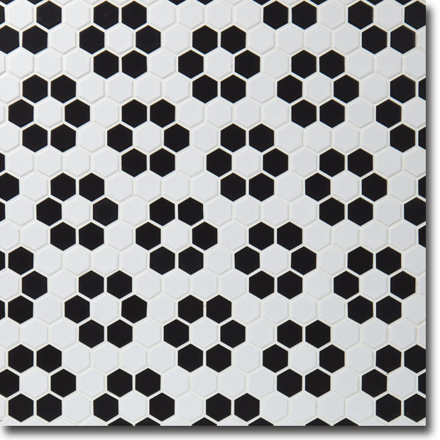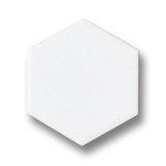 アメリカのクラシックなホテルやダイナーで見かけるヘキサゴンタイル。大胆にロゴを描いたり、グラフィカルな柄をあしらったりと、オリジナリティあふれるデザインを楽しめます。黒と白の2色に絞ることで柄が引き立ち、シンボリックな空間を演出。質感はブライト、マットの2タイプご用意しました
