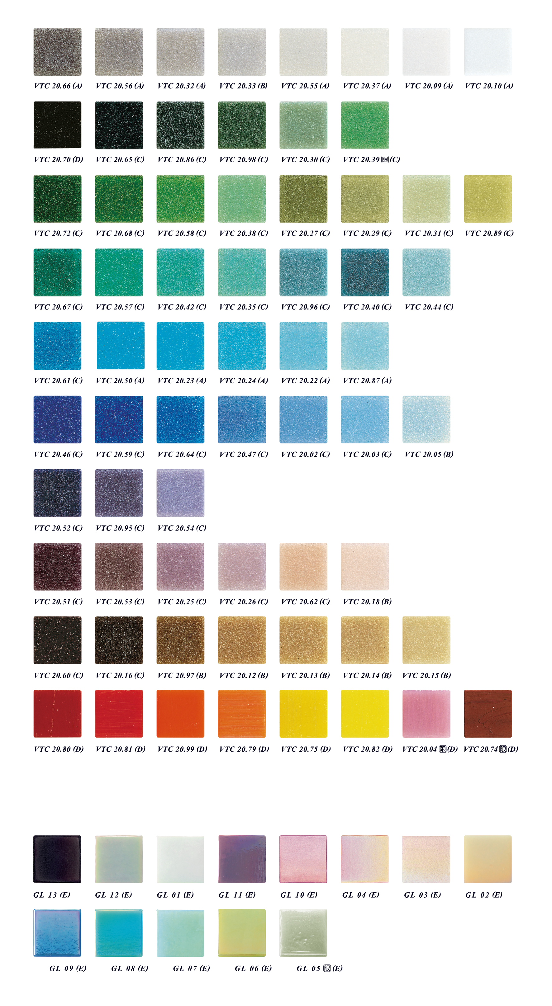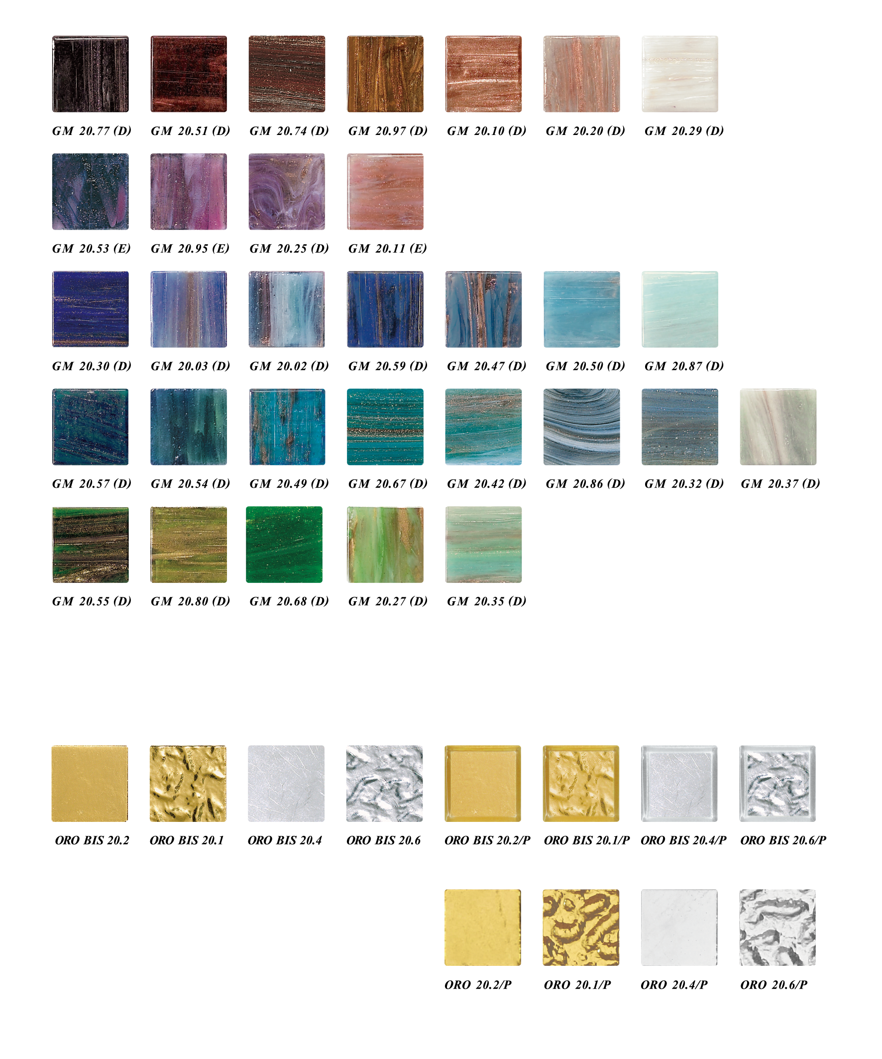 最高品質を誇るBISAZZAのガラスタイルは、ソリッドカラーのVTC、アベンチュリンを含有するGM、エナメル質感のSM、パール色の輝きを放つGLの4種類2形状(10mm角、20mm角)約150のカラーバリエーションで展開。また、ゴールドシリーズOROは、24カラットのゴールドリーフを、2つのレイヤーでサンドイッチのように挟んだもので、10mm角、20mm角からお選びできます。12mm角ならベネチアングラスを配合しエナメル加工を施したOR 50色で対応可能です。画一的なグリッドと極色彩の変化が寂たる空間を表現します。同形状であれば自由自在なブレンドが可能です。