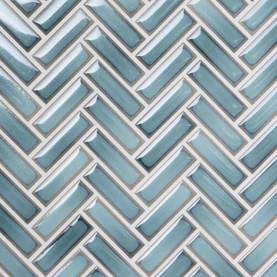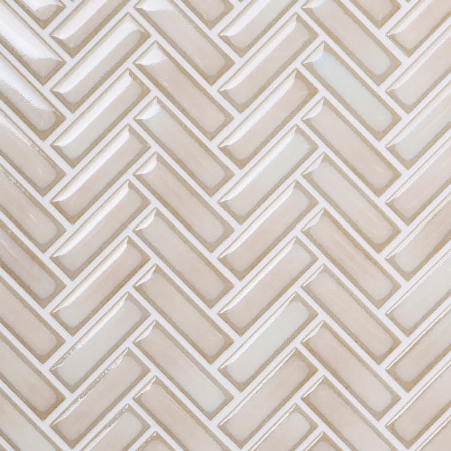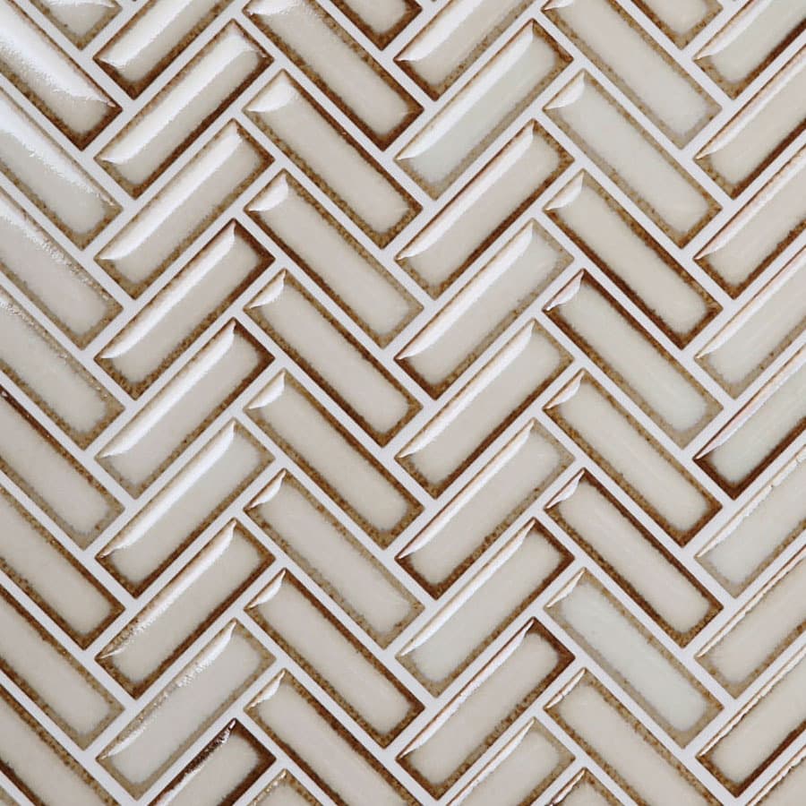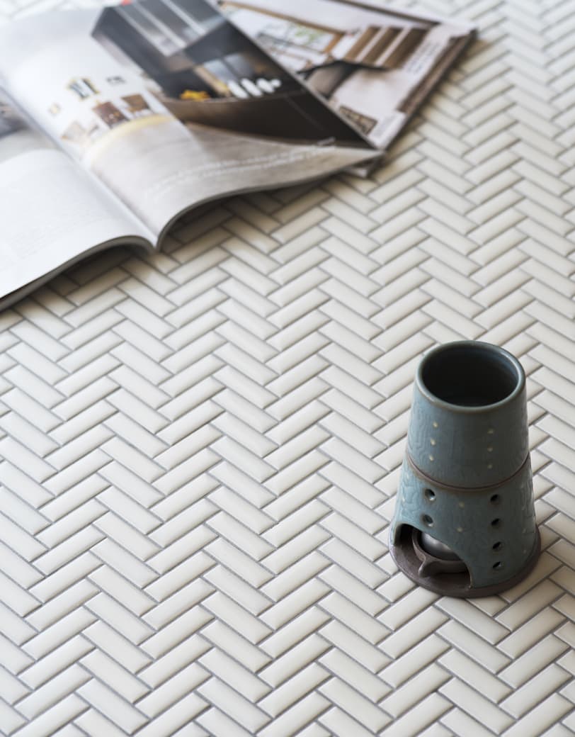ピースによって色むらや濃淡が異なる表情豊かなボーダータイル。古きよき時代のカフェで見かけるような色調でありながら、スリムな幅にすることで現代風にアレンジしました。ヘリンボーン貼りでレトロモダンに、すだれ貼りでスタイリッシュに。デザインによって印象ががらりと変わるのも魅力です。