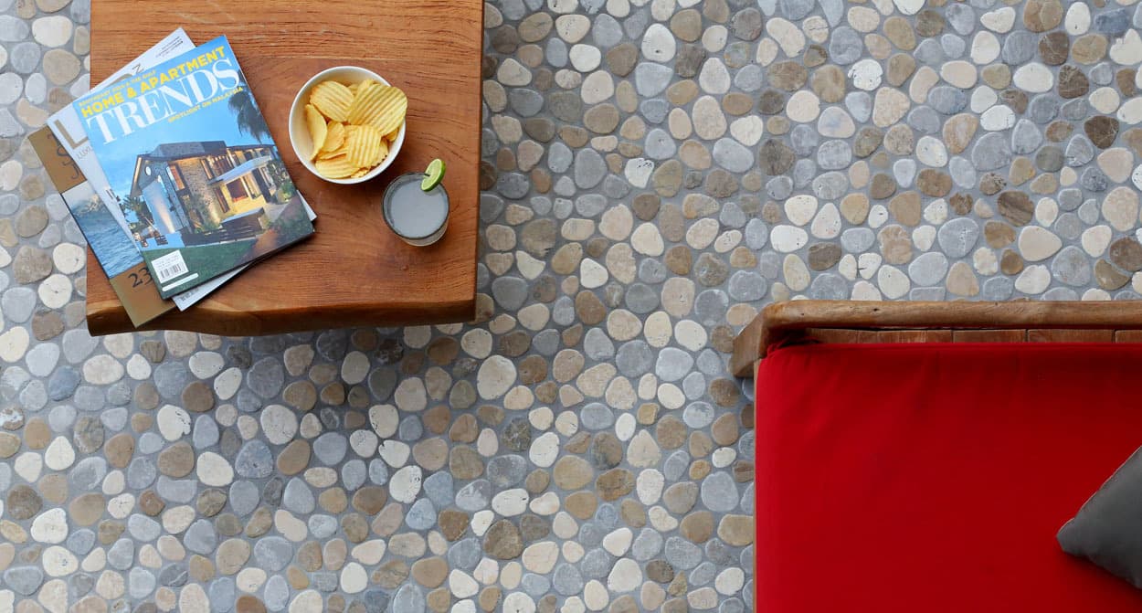 インドネシアやインドで採石された天然石を使用。長い歳月をかけて自然がつくり上げた造形美を最大限に引き出しました。豊かな緑に抱かれたリゾートホテルを彷彿とさせる、くつろぎに満ちたラグジュアリー空間を演出します。つるりとした肌ざわりが心地よく、素足で過ごしたくなるタイルです。